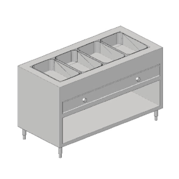 GABINETE EN ISLA CON BAÑO MARÍA DE 2 A 5 INSERTOS EN ACERO INOXIDABLE A GAS, CUBIERTA Y TINA EN CALIBRE 18, FALDONES, PISO EN CALIBRE 20, CON QUEMADOR A GAS Y VÁLVULA COMERCIAL PATAS TUBULARES DE 1 1/2″ CON REGATONES NIVELADORES.
