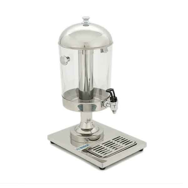 DESPACHADOR DE JUGOS DE UN TANQUE. FABRICADO EN ACERO INOXIDABLE Y ACRÍLICO, CAPACIDAD DE 8 L. TUBO INTERMEDIO PARA HIELO INDEPENDIENTE. CHAROLA DE RESIDUOS.