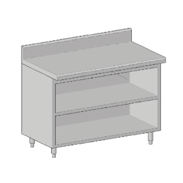 GABINETE ABIERTO FABRICADO EN ACERO INOXIDABLE CON CUBIERTA Y LAMBRÍN EN CALIBRE 18, FALDÓN Y ENTREPAÑO EN CALIBRE 20, PATAS EN TUBULAR DE 1 1/2″ CON REGATONES NIVELADORES.