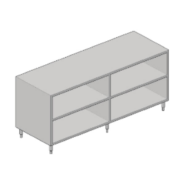 GANINETE ABIERTO EN ISLA FABRICADO EN ACERO INOXIDABLE, CUBIERTA EN CALIBRE 18, FALDÓN, ENTREPAÑO Y PISO EN CALIBRE 20, CON PATAS TUBULARES DE 1 1/2″ Y REGATONES NIVELADORES, SIN RESPALDO.