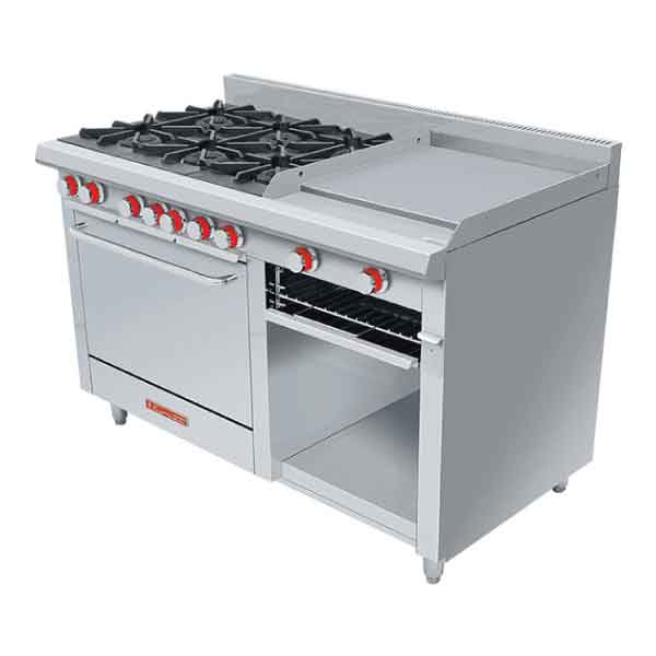 ESTUFA CON 3 PARRILLAS DE FUNDICION CON 2 QUEMADORES EN CADA UNA, PLANCHA CON GRATINADOR Y UN HORNO