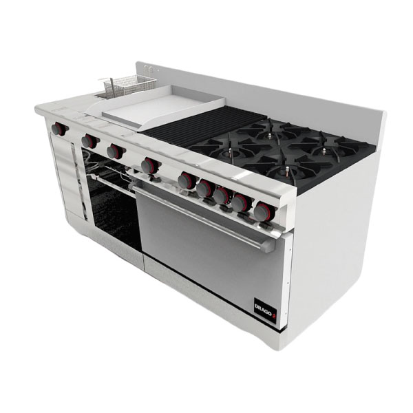Estufa con 4 quemadores, horno, asador de 1 pie, plancha de 2 pies, freidor y gratinador * Medidas 182.9 Fte x 79 Fdo x 90 Alt * Medidas del Horno 66.5 Fte x 58 Fdo x 36.5 Alt * Medidas de la Plancha 91.1 Fte x 50.5 Fdo * Capacidad del freidor de 4 Lts