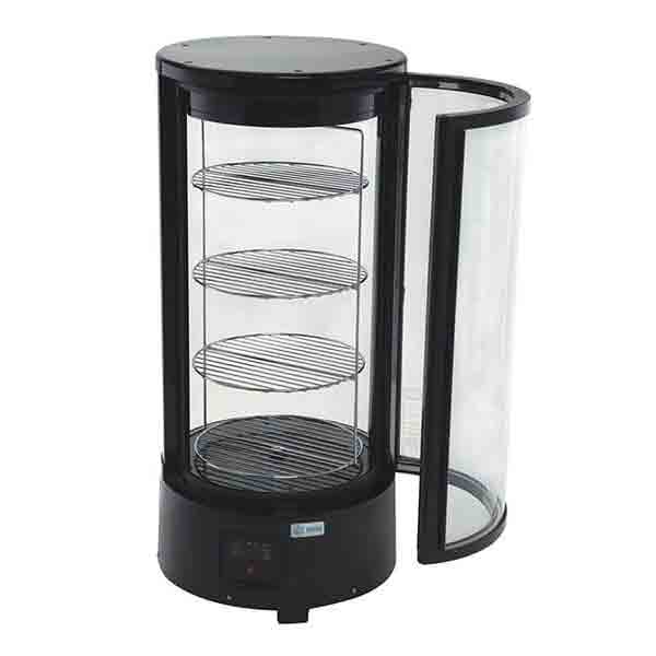 REFRIGERADOR CIRCULAR CON PARRILLAS GIRATORIAS DE 4 NIVELES, EN COLOR NEGRO, UNA PUERTA ABATIBLE, CONTROL DIGITAL DE TEMPERATURA DE 0 A 12 °C, ILUMINACIÓN INTERIOR EN LEDS.
